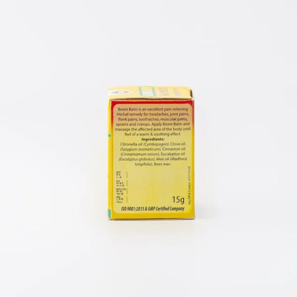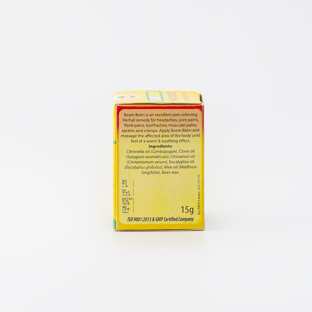 Beam Balm is an excellent pain relieving Herbal remedy for headaches, joint pains, flank pains, toothaches, muscular pains, sprains and cramps. Apply Beam Balm and massage the affected area of the body until feel of a warm & soothing effect.
