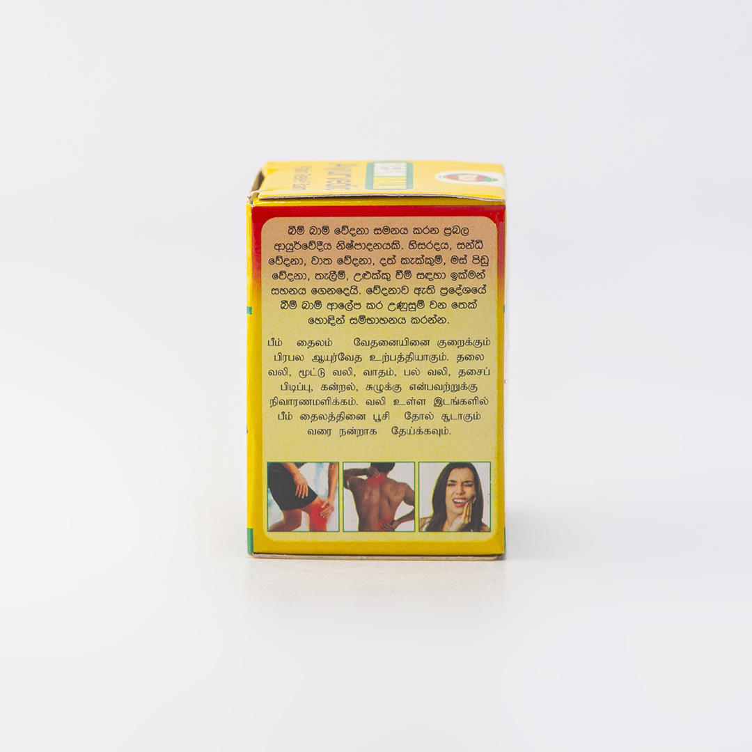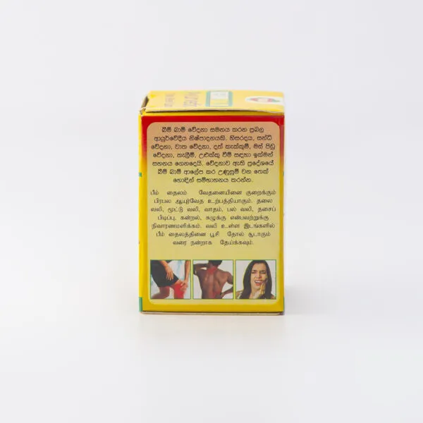 බීම් බාම් වේදනා සමනය කරන ප්රබල ආයුර්වේදීය නිෂ්පාදනයකි. හිසරදය, සන්ධි වේදනා, වාත වේදනා, දත් කැක්කුම්, මස් පිඩු වේදනා, තැලීම්, උළුක්කු වීම් සඳහා ඉක්මන් සහනය ගෙනදෙයි.