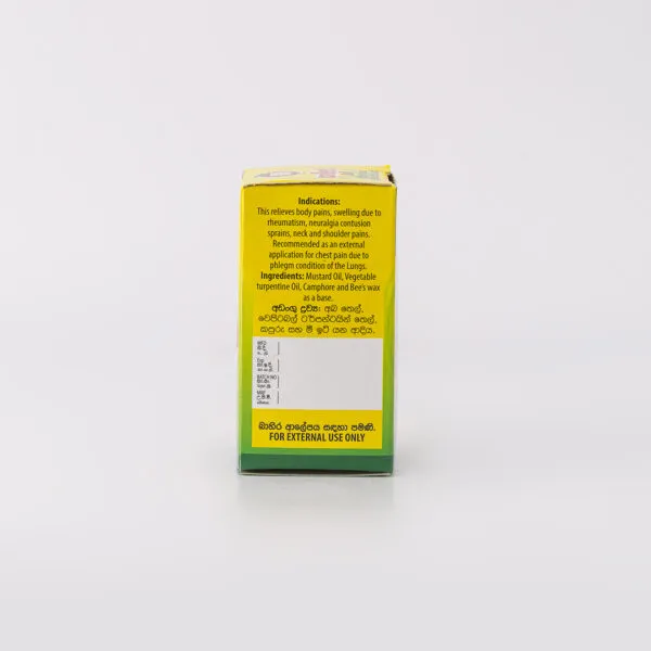 Sarsapathi Oil, Cinnamon Oil, Menthol, Camphor and Bee’s Wax as a base.