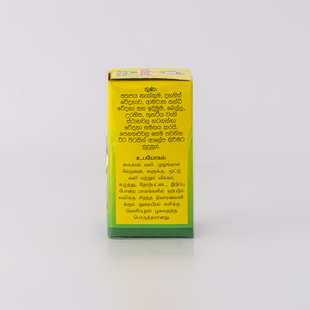 கைகால் நோவு, முழங்கால் வலி, மூட்டு வலி மற்றும் வீக்கம், கழுத்து, தோல், விலா ஆகிய இடங்களில் ஏற்படும் வேதனைகளுக்கான நிவாரணி.