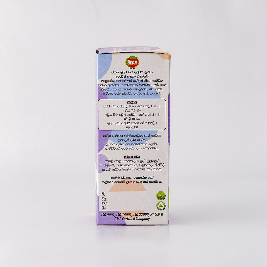 குழந்தைகளில் புழுக்களால் ஏற்படும் நோய் மற்றும் வேறு காரணங்களினால் ஏற்படும் உணவு குமட்டலிற்கு விசேடமாக தயாரிக்கப்பட்டது. இந்த பானி உணவு சமிபாடடையாமை, வயிற்று பொருமல், அஜீரணம் போன்ற சர்ந்தப்பங்களுக்கு சிறந்தது.