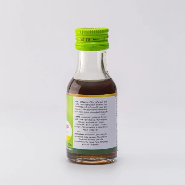 Beneficial for paralysis, facial palsy, and other severe Vata disorders. It alleviates stiffness of the neck and head ailments, and is highly effective for Panchakarma treatments such as internal use, massage, and enema.