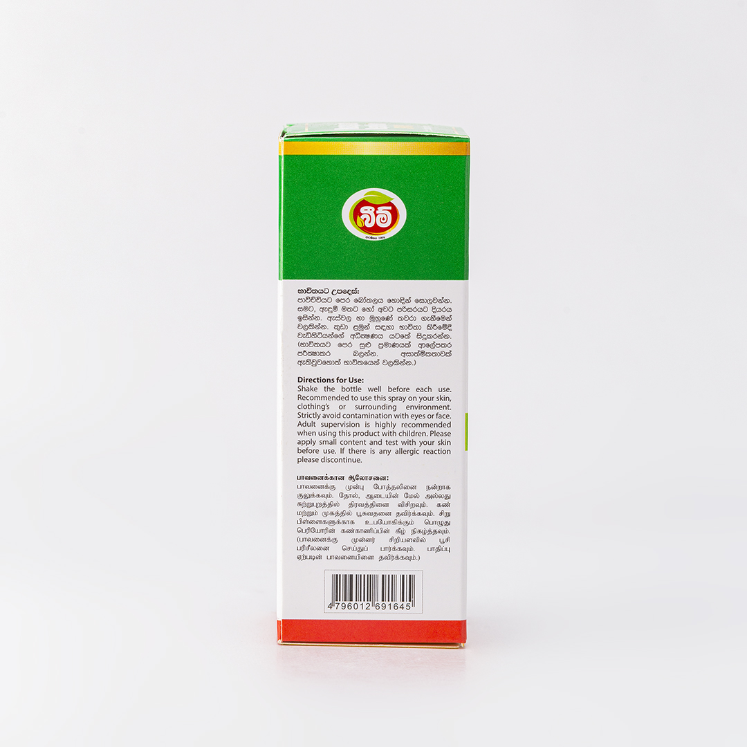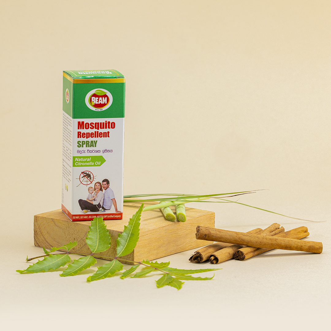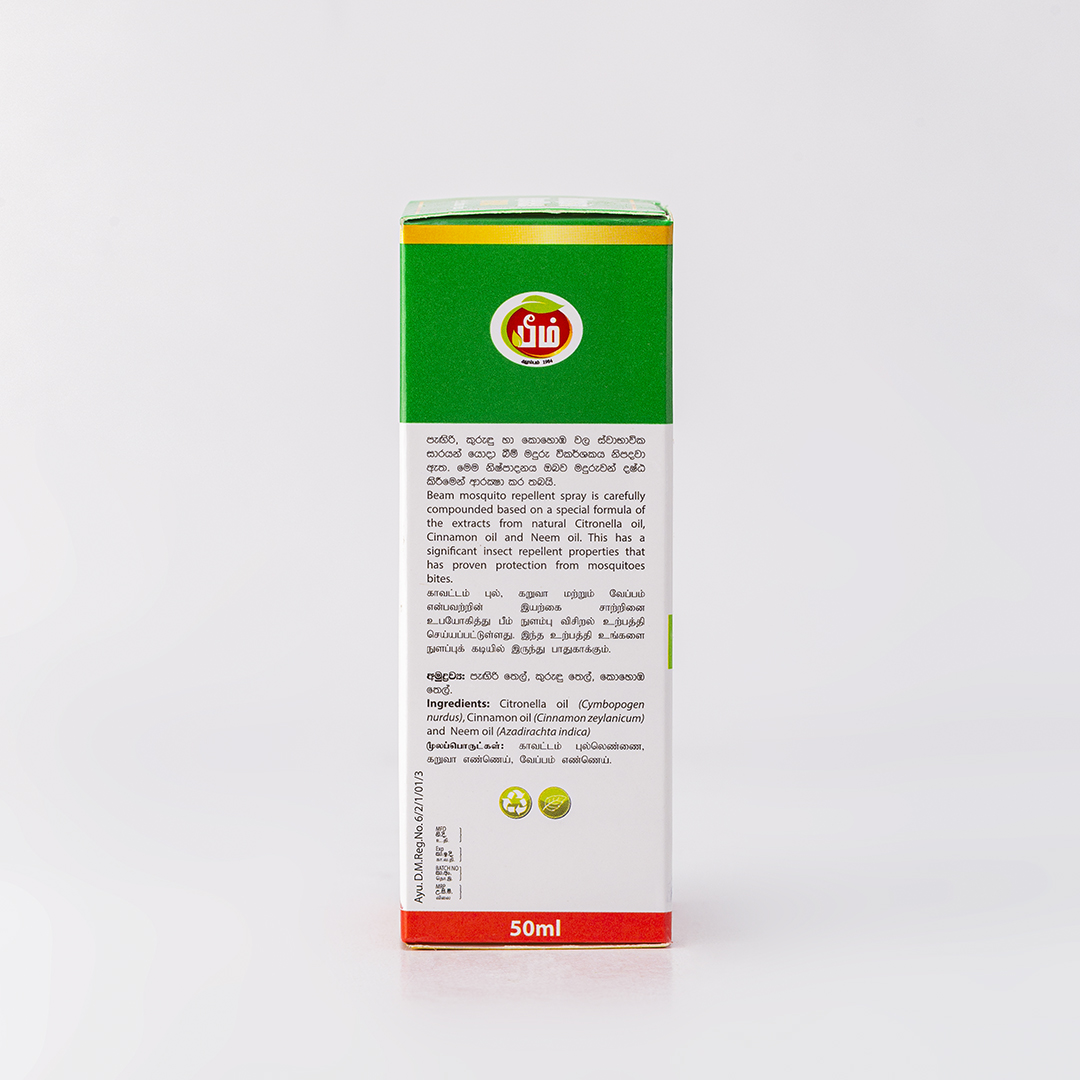 පැඟිරි, කුරුඳු හා කොහොඹ වල ස්වාභාවික සාරයන් යොදා බීම් මදුරු විකර්ශකය නිපදවා ඇත. මෙම නිෂ්පාදනය ඔබව මදුරුවන් දෂ්ඨ කිරීමෙන්් ආරක්‍ෂා කර තබයි.