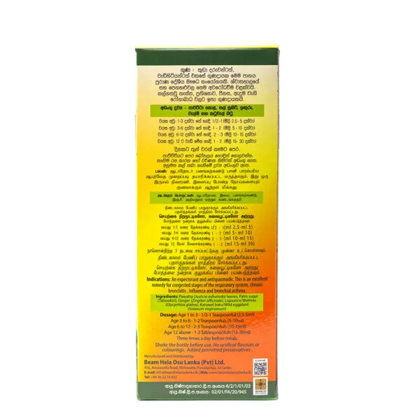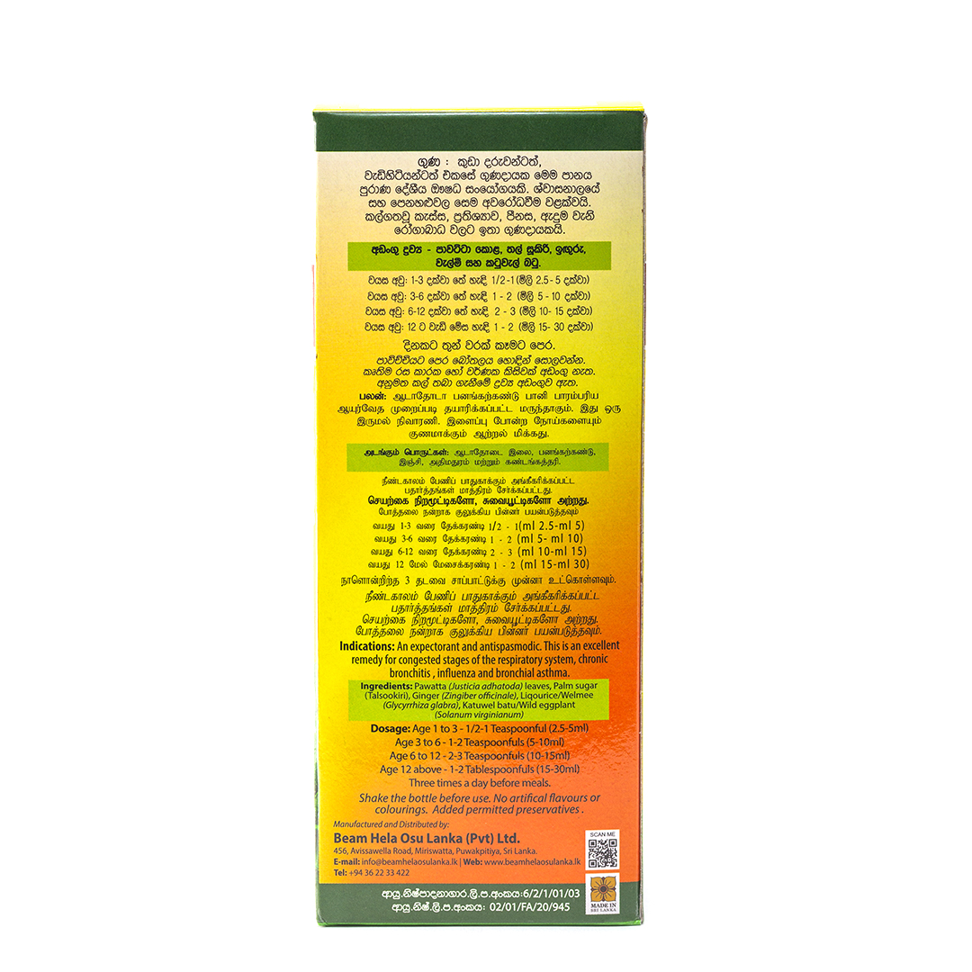 Pawatta (Justicia adhatoda) leaves, Palm sugar (Talsookiri), Ginger (Zingiber officinale).