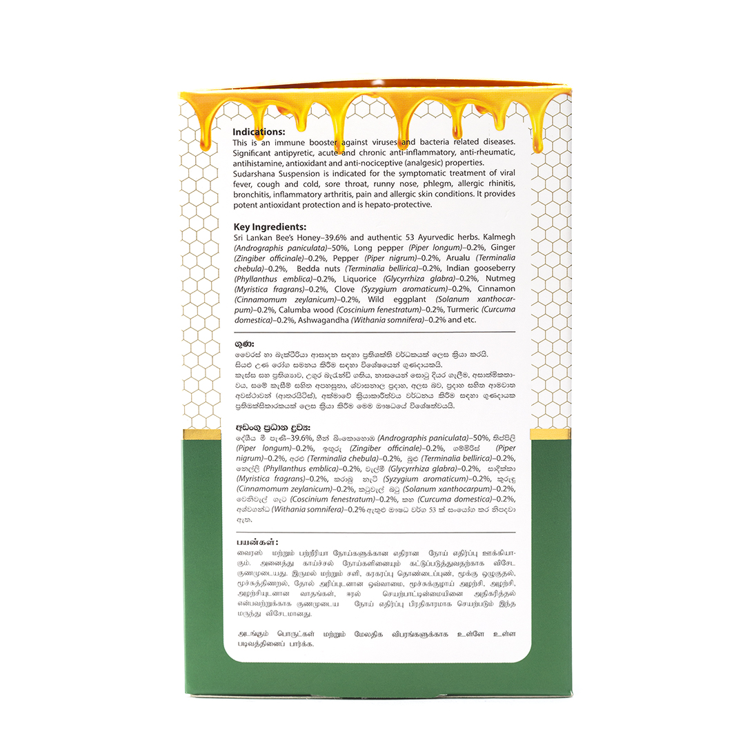 Sri Lankan Bee’s Honey and authentic 53 Ayurvedic herbs. Kiratha (Andrographis paniculata), Long pepper (Piper longum), Ginger (Zingiber officinale), Pepper (Piper nigrum), Arualu (Terminalia chebula), Bedda nuts (Terminalia bellirica), Indian gooseberry (Phyllanthus emblica), Liquorice (Glycyrrhiza glabra), Nutmeg (Myristica fragrans), Clove (Syzygium aromaticum), Cinnamon (Cinnamomum zeylanicum), Wild eggplant (Solanum xanthocarpum), Calumba wood/Venivel (Coscinium fenestratum), Turmeric (Curcuma longa), Ashwagandha (Withania somnifera) etc.