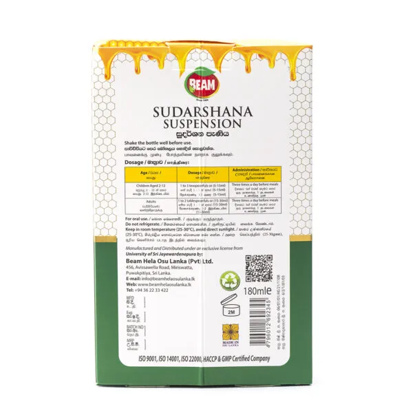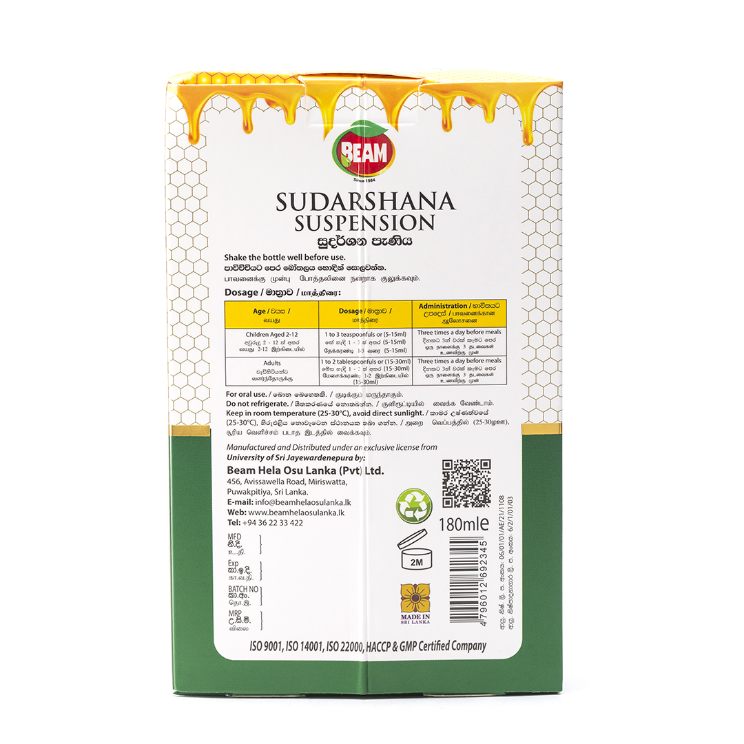 This is an immune booster against viruses and bacteria related diseases. Significant antipyretic, acute and chronic anti-inflammatory, anti-rheumatic, antihistamine, antioxidant and anti-nociceptive (analgesic) properties. Sudarshana Suspension is indicated for the symptomatic treatment of viral fever, cough and cold, sore throat, runny nose, phlegm, allergic rhinitis, bronchitis, inflammatory arthritis, pain and allergic skin conditions. It provides potent antioxidant protection and is hepato-protective.
