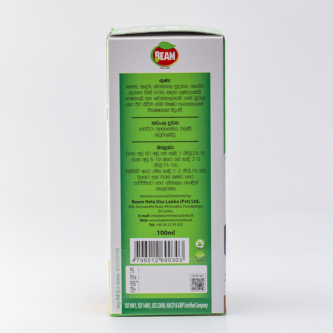 කැස්ස , ඇදුම , ශ්වාසනාල ප්රදාහය කොඨර ප්රදාහය වැනි රෝග සඳහා ගුණදායකයි. පෙණහැලි සහ ශ්වාසනාලයෙහි සෙම බුරුල් කර පිට කිරීම මෙම ඖෂධ සංයෝගයෙන් විශේෂයෙන් සිදුවේ