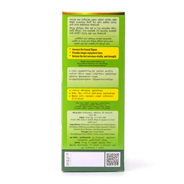 හීන වී ගිය ශරීර ශක්තිය නැවත ඇති කරන ශක්තිජනක ඖෂධයකි, ස්නායු දුර්වලතා නිසා හට ගන්නා හිරි වැටීම, වාත වේදනා, සන්ධි වේදනා ආදියට සහ බඩගිනි මද බව වැනි ආබාධ වලට ගුණදායකයි.මෙම ඖෂධය සීනි රහිත පානයක් ලෙසද ලබා ගත හැක.